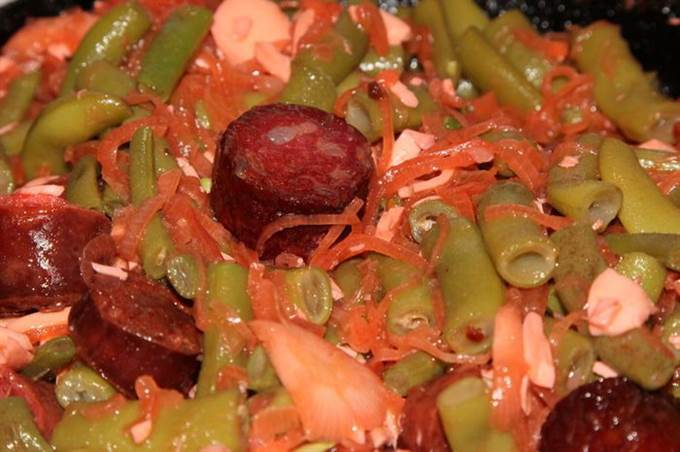 Отварную фасоль отбрасываем на дуршлаг, обдаем холодной водой, даем стечь и отправляем к колбаскам. Добавляем водички и тушим 10 минут, помешивая периодически.