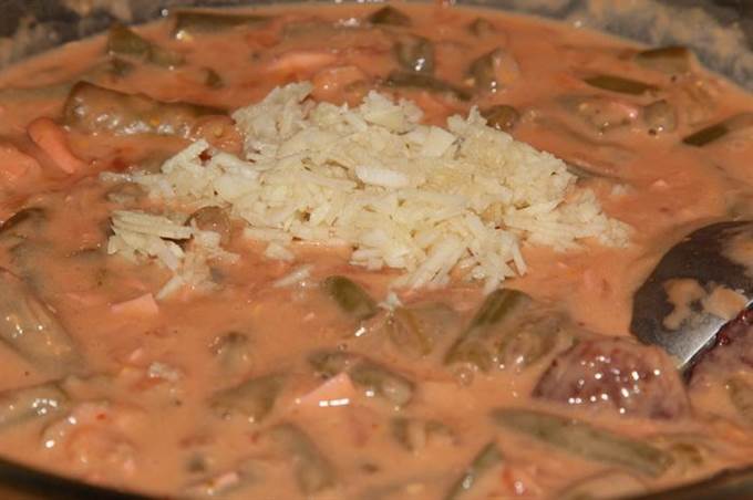 Выливаем наш соус в посуду с паприкашем, перемешиваем, добавляем еще воды и тушим на маленьком огне все вместе до загустения.