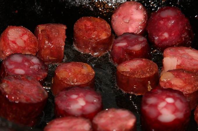 Здесь такой момент: если вас не пугает жирность блюда, обжаривайте их на растительном масле. Я обжаривала без масла, у меня образовалось достаточно жира для последующей пассеровки лука. Так что тут каждый принимает решение сам. После обжарки колбаски выкладываем в отдельную емкость.