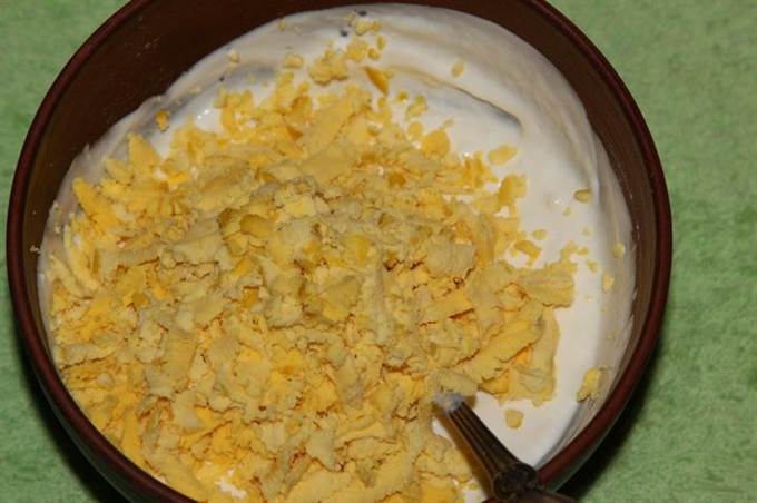 Затем на терке натираем желток и добавляем к сметанно-мучной смеси