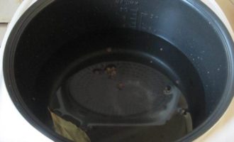 В чашу мультиварки налить воду. Посолить, добавить лавровый лист, черный и душистый перец горошком.