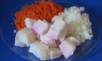 Овощи вымыть, очистить. Морковь натереть на терке, лук мелко нарезать. Рыбу нарезать кусочками.