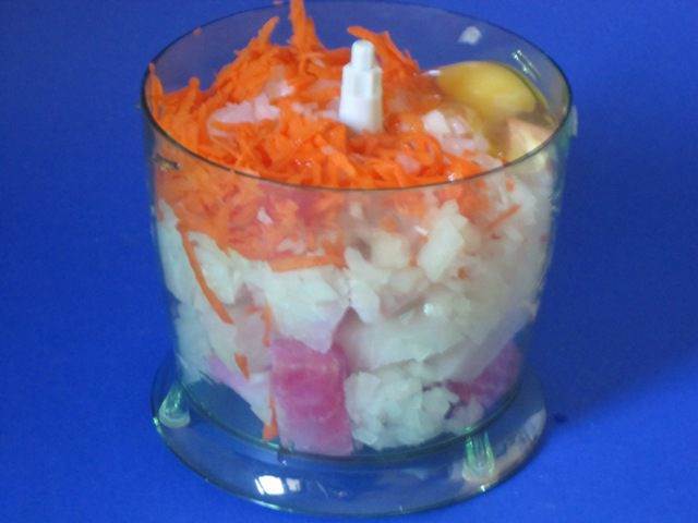 Выложить в блендер, посолить, поперчить. Добавить яйцо.