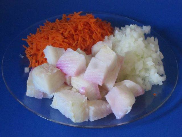 Овощи вымыть, очистить. Морковь натереть на терке, лук мелко нарезать. Рыбу нарезать кусочками.