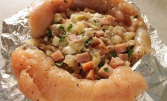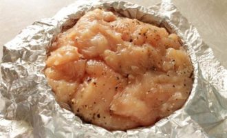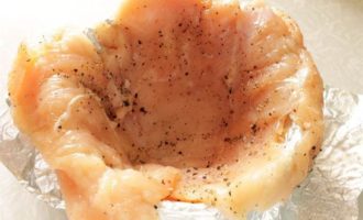 Теперь берем пиалу, выстилаем ее фольгой, оставляя свободные края. Фольгу слегка смазать растительным маслом. Затем выкладываем отбитое филе, руками аккуратно распределяем по дну и стенкам пиалы, филе должно быть с запасом, чтобы можно было закрыть начинку.