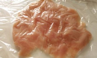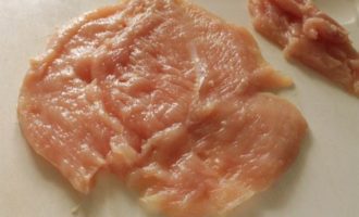 Куриное филе разрезать горизонтально и раскрыть книжкой. Срезать выступающие мелкие кусочки (примерно 100-120 гр) и отложить их в сторону, они пойдут в начинку.