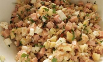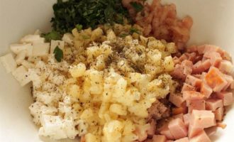 Ветчину и сыр нарезать кубиком, сырое филе, которое мы откладывали, тоже мелко нарезать, добавить хлебные крошки, остывшие яблоки с луком, измельченную зелень петрушки, щепотку сухого тимьяна, молотый перец и немножко соли.