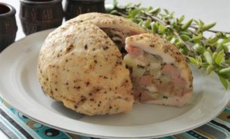 Запекаем в предварительно нагретой духовке при 180 градусах 40 минут.Затем достать из духовки, разорвать фольгу, с помощью кисточки смазать всю поверхность купола сметаной и снова отправить в духовку, чтобы мясо немного подрумянилось.