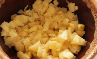 У яблок удалить кожицу и сердцевину, нарезать кубиком (два не очень крупных или одно крупное). Репчатую луковицу среднего размера нарезать мелким кубиком. Обжарить до прозрачности на смеси растительного и сливочного масла, затем добавить яблоко и, помешивая, обжарить до мягкости, но кусочки должны оставаться целыми. Остудить.