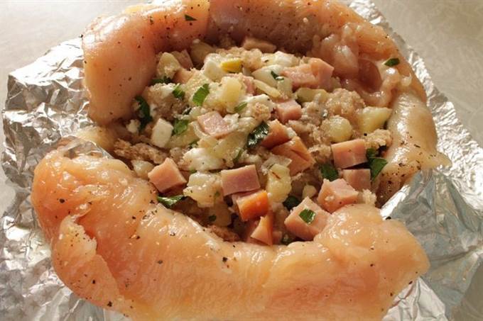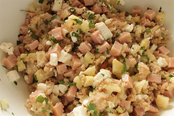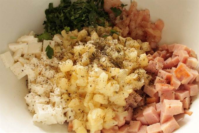 Ветчину и сыр нарезать кубиком, сырое филе, которое мы откладывали, тоже мелко нарезать, добавить хлебные крошки, остывшие яблоки с луком, измельченную зелень петрушки, щепотку сухого тимьяна, молотый перец и немножко соли.