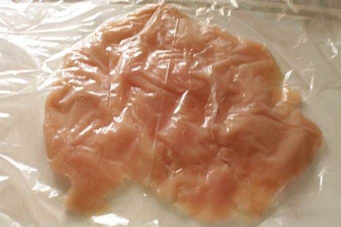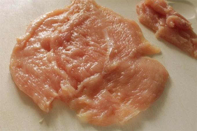 Куриное филе разрезать горизонтально и раскрыть книжкой. Срезать выступающие мелкие кусочки (примерно 100-120 гр) и отложить их в сторону, они пойдут в начинку.