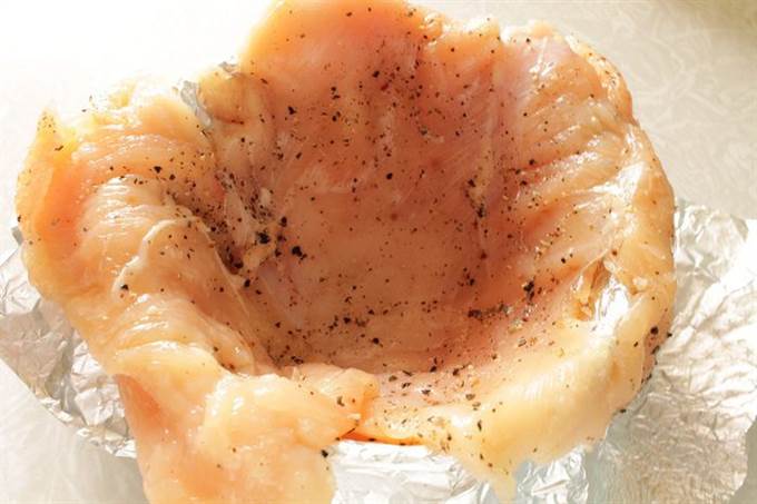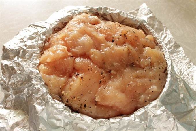 Теперь берем пиалу, выстилаем ее фольгой, оставляя свободные края. Фольгу слегка смазать растительным маслом. Затем выкладываем отбитое филе, руками аккуратно распределяем по дну и стенкам пиалы, филе должно быть с запасом, чтобы можно было закрыть начинку.
