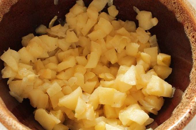 У яблок удалить кожицу и сердцевину, нарезать кубиком (два не очень крупных или одно крупное). Репчатую луковицу среднего размера нарезать мелким кубиком. Обжарить до прозрачности на смеси растительного и сливочного масла, затем добавить яблоко и, помешивая, обжарить до мягкости, но кусочки должны оставаться целыми. Остудить.