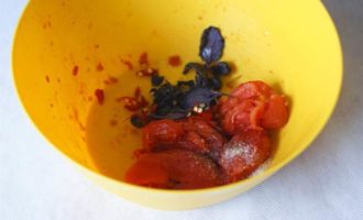 Добавим соль, перец по вкусу, базилик и, по желанию, острый перец чили. Все это пюрируем и пока отставляем. -
