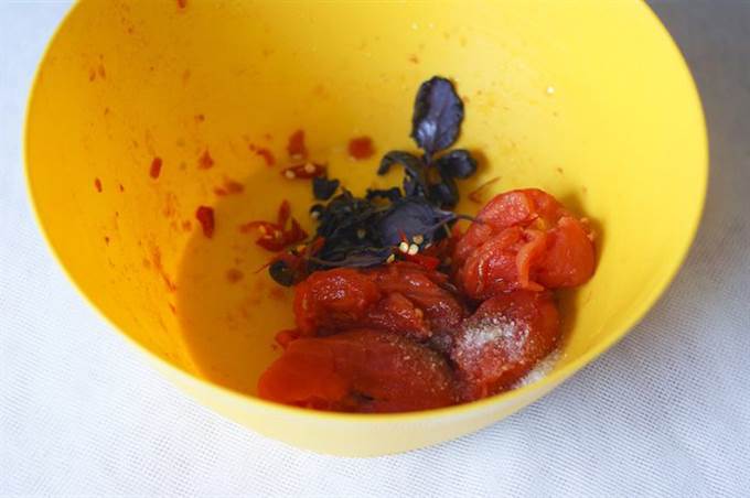 Добавим соль, перец по вкусу, базилик и, по желанию, острый перец чили. Все это пюрируем и пока отставляем. -