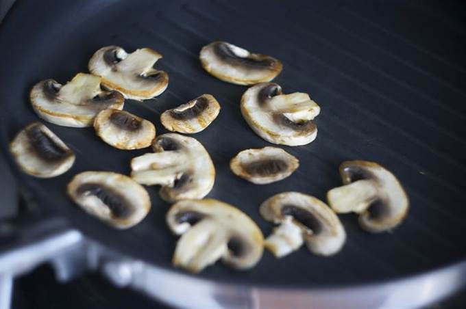 Обжариваем на сковороде-гриль (для красоты) или обычной наши овощи и/или грибы, которые порезали тонкими пластинками.