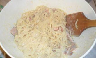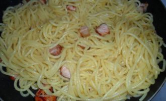 Затем частями вмешивать пасту с беконом в соус. Хорошо перемешивая. При необходимости добавить воды где варилась паста.