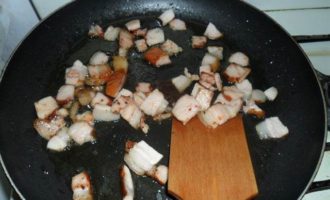 Пока паста варится, мы на разогретую сковороду вливаем оливковое масло и высыпаем нарезанный кубиками бекон. Помешивая обжариваем его до золотистого цвета.