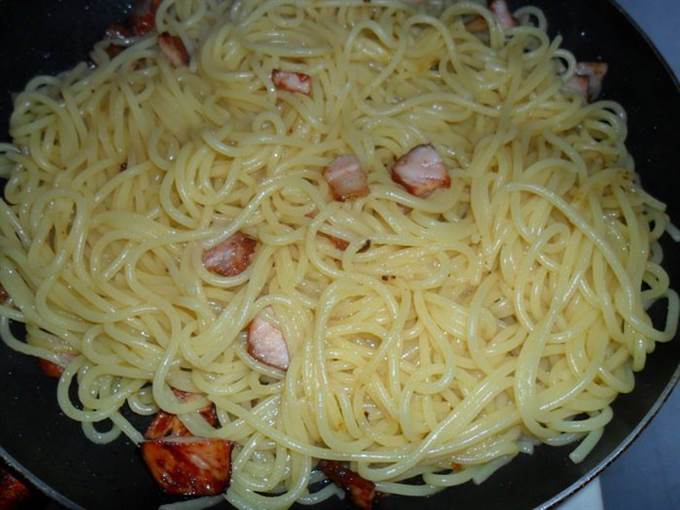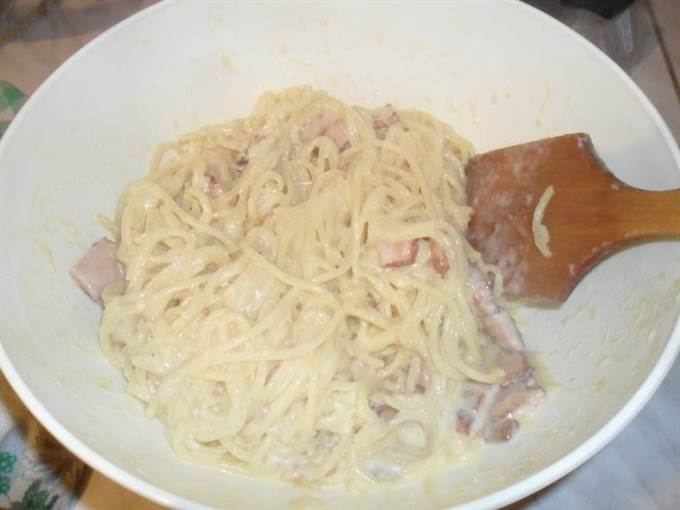 Затем частями вмешивать пасту с беконом в соус. Хорошо перемешивая. При необходимости добавить воды где варилась паста.