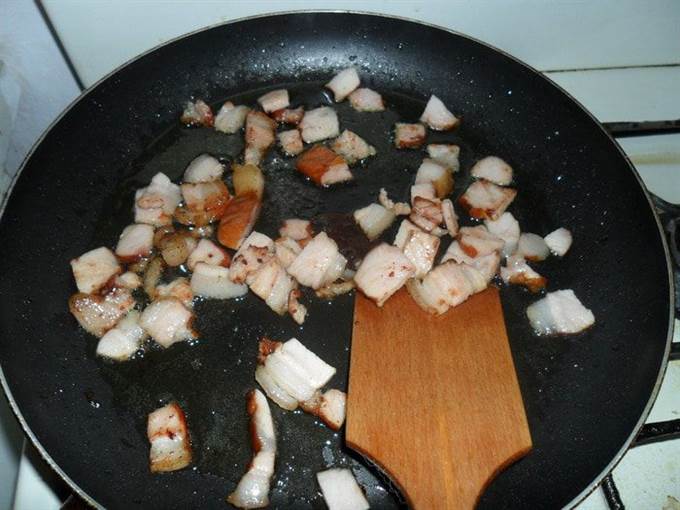Пока паста варится, мы на разогретую сковороду вливаем оливковое масло и высыпаем нарезанный кубиками бекон. Помешивая обжариваем его до золотистого цвета.