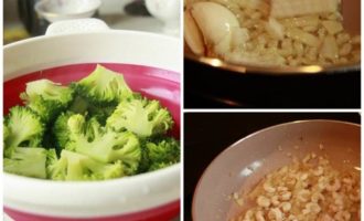 • Помыть брокколи, разделать на соцветия и отварить в кипящей воде 3 минуты. Откинуть на дуршлаг, оставить остывать.