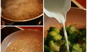 Когда жидкость испарится, добавить брокколи и сливки, приправить молотым перцем и оставить доходить на медленном огне.