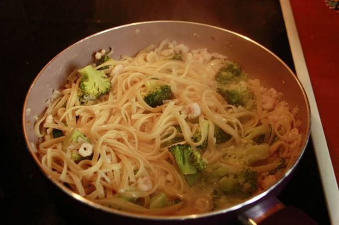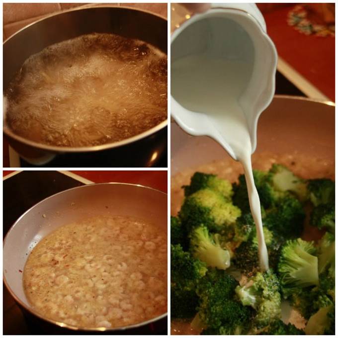 Когда жидкость испарится, добавить брокколи и сливки, приправить молотым перцем и оставить доходить на медленном огне.