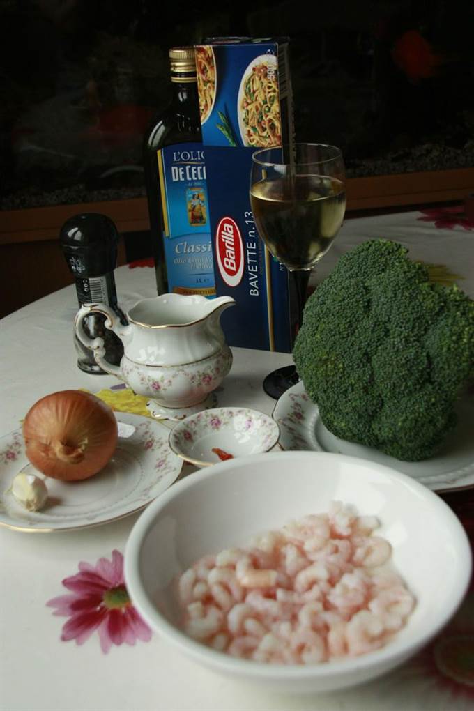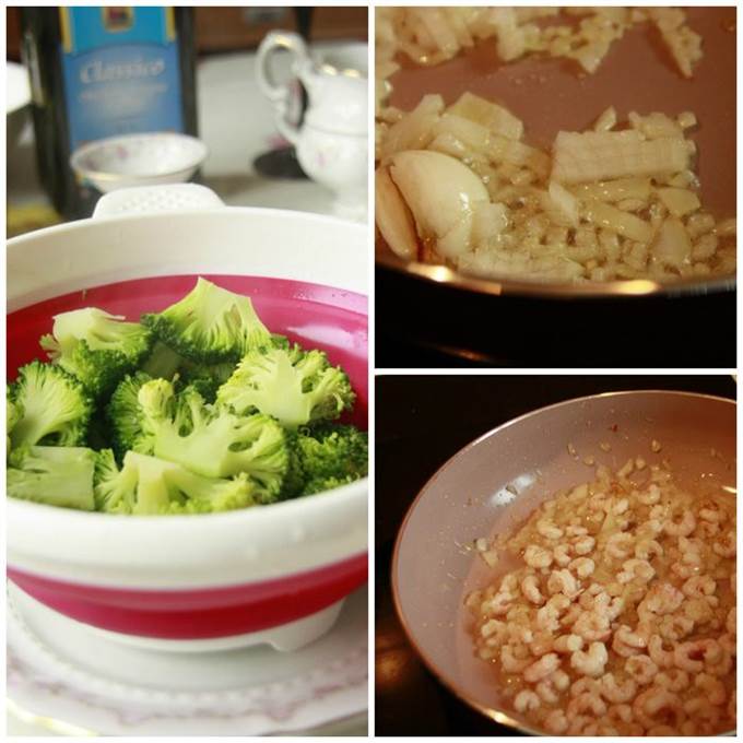 Когда лук зарумянится, вынуть чеснок и выбросить, добавить креветки и мелко поломанный сухой красный перец.