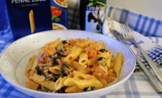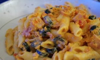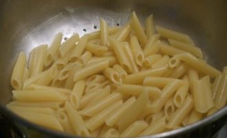 Тем временем отварить пасту в подсоленной кипящей воде до готовности, согласно указаниям на упаковке. Слить готовую пасту.