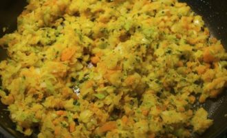 Тем временем овощи очистить и мелко порубить (можно с помощью блендера для достижения однородности нарезки овощей. Количество овощей можете регулировать также на свой вкус. Я беру 2 небольшие морковки и 2 луковицы…) Петрушку измельчить. В сковороде с тяжелым дном разогреть 2 ст.л. оливкового масла. Положить обжариваться овощи.