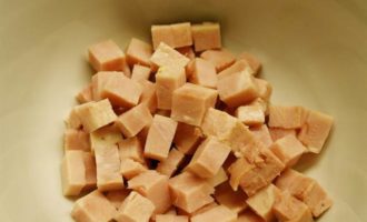 Вареную ветчину нарезать небольшими кубиками. Сложить в миску.