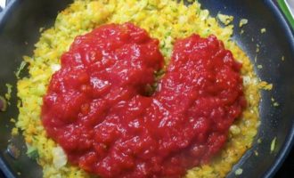 Добавить предварительно размятые томаты в собственном соку. Посолить и поперчить по вкусу и готовить томатный соус около 8 минут на среднем огне, время от времени помешивая.