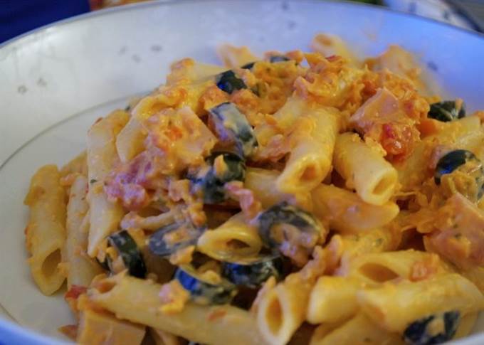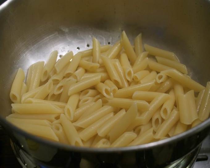 Тем временем отварить пасту в подсоленной кипящей воде до готовности, согласно указаниям на упаковке. Слить готовую пасту.