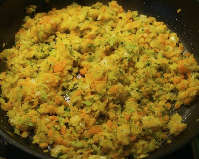 Тем временем овощи очистить и мелко порубить (можно с помощью блендера для достижения однородности нарезки овощей. Количество овощей можете регулировать также на свой вкус. Я беру 2 небольшие морковки и 2 луковицы…) Петрушку измельчить. В сковороде с тяжелым дном разогреть 2 ст.л. оливкового масла. Положить обжариваться овощи.