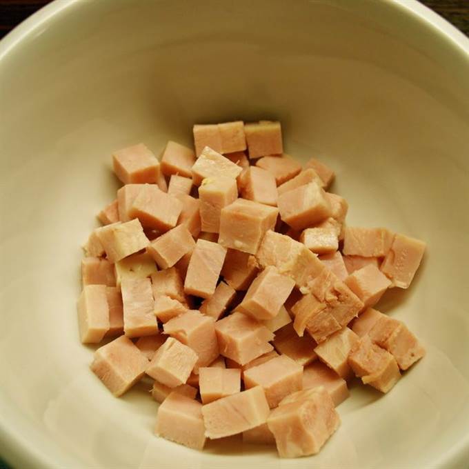 Вареную ветчину нарезать небольшими кубиками. Сложить в миску.