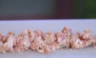 У колбаски разрезать оболочку, вынуть фарш и измельчить его.