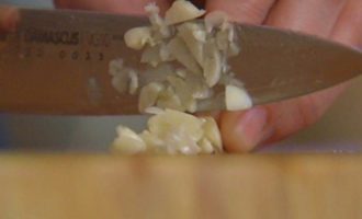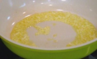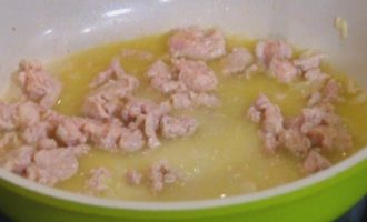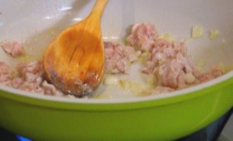 Выложить фарш и чеснок в сковороду с луком, прибавить огонь и обжарить все до золотистого цвета.