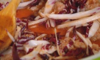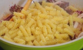 Радиккио тонко нарезать, отправить к фаршу и слегка припустить.