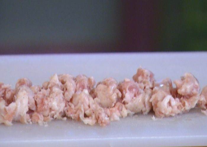 У колбаски разрезать оболочку, вынуть фарш и измельчить его.