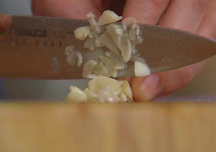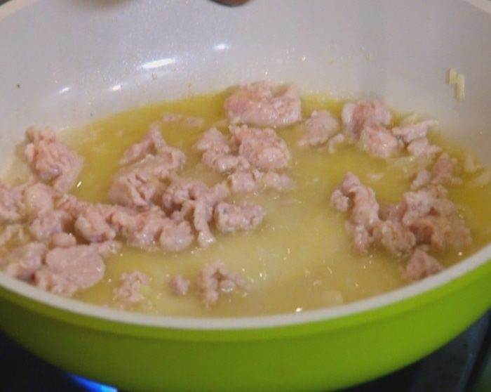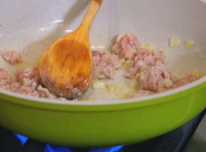 Выложить фарш и чеснок в сковороду с луком, прибавить огонь и обжарить все до золотистого цвета.