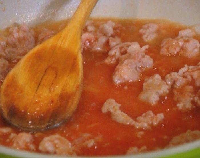 Влить в сковороду с фаршем вино и дать ему выпариться.