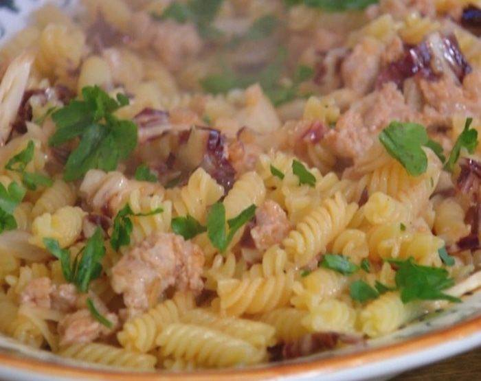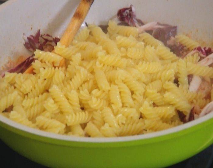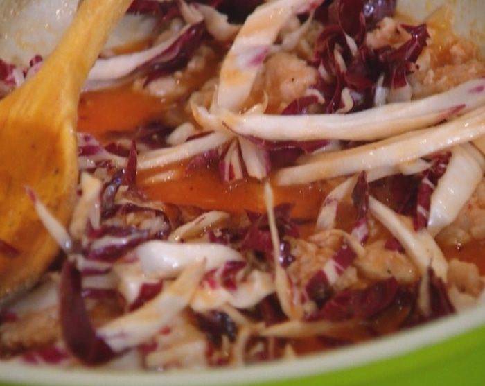 Радиккио тонко нарезать, отправить к фаршу и слегка припустить.