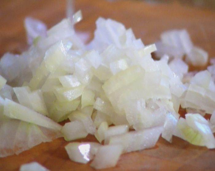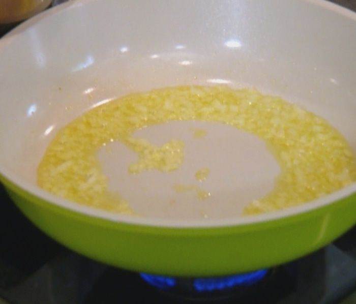 Разогреть в сковороде 2 ст. ложки оливкового масла и обжарить лук до прозрачности.