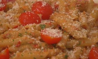 В горячие макароны добавить 2 ст. ложки красного песто, перемешать, влить пару столовых ложек воды, в которой варились макароны, и еще раз перемешать.