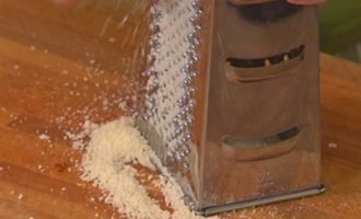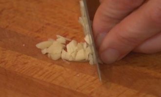 Чеснок почистить, раздавить плоской стороной ножа и порезать.
