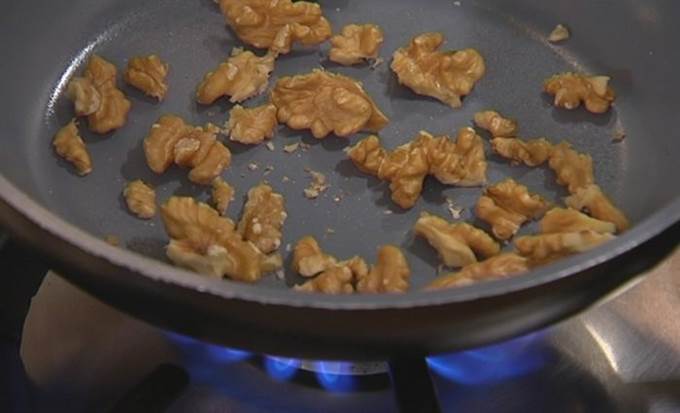 Грецкие орехи поломать на кусочки и поджарить на сухой сковороде.