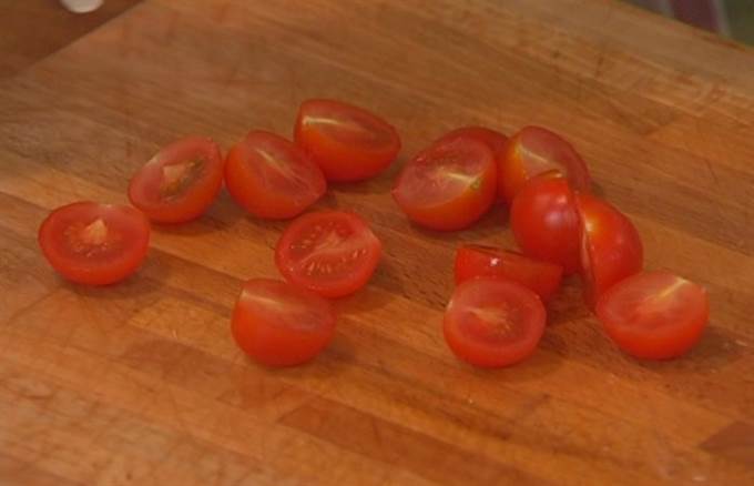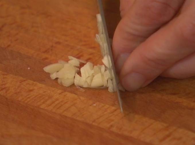 Чеснок почистить, раздавить плоской стороной ножа и порезать.