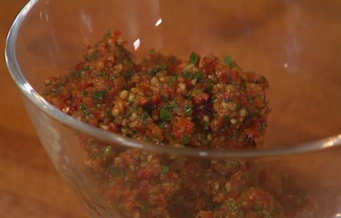 Приготовить соус песто: в блендере соединить вяленые помидоры, грецкие орехи, петрушку, чеснок, пеперончино, влить оливковое масло Extra Virgin, посолить, поперчить и все измельчить.