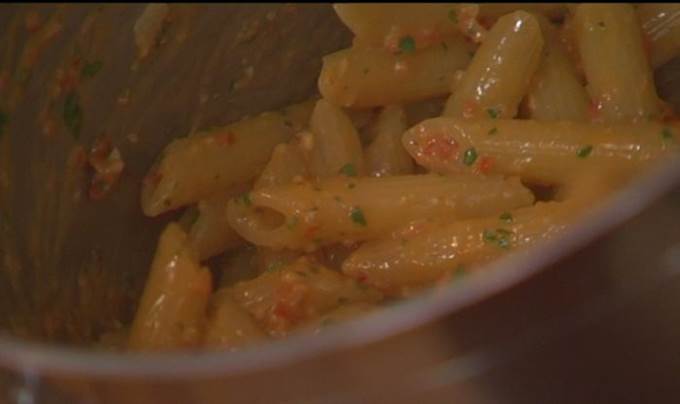 В горячие макароны добавить 2 ст. ложки красного песто, перемешать, влить пару столовых ложек воды, в которой варились макароны, и еще раз перемешать.
