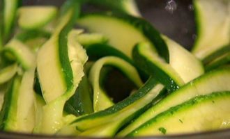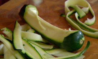 Цукини вместе с кожурой нарезать тонкими длинными полосками (можно воспользоваться овощечисткой).
